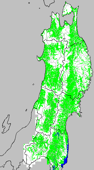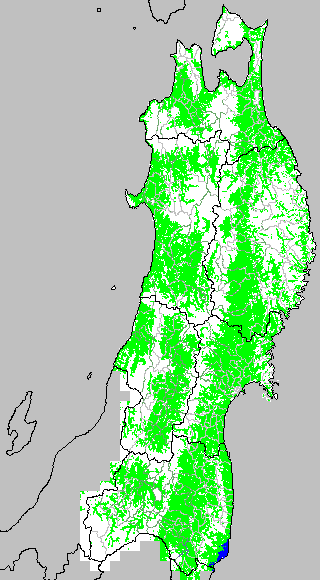 警戒メッシュ説明: 右図は最低気温の過去5日間平均値を水田分布メッシュ対象で示したものです。栽培管理等の参考にして下さい。 なお、最低気温区分には次の基準温度を参考にしています。 ○高温障害に警戒が必要:24度以上 ○高温障害に注意が必要:23度〜24度 |