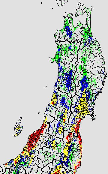 安全作期の策定にある気温指標のうち、いもち病蔓延可能日の平均気温指標20.0℃を用いて表示し、20.0℃未満については1℃刻みで表示します。過去7日の移動平均値で示す。いもち病の蔓延可能域を監視するものです。