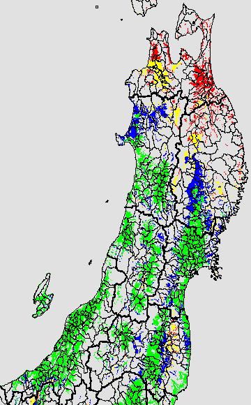 各種文献などを参考にして、分げつ形成に関する限界温度を平均気温で15℃と設定し、15℃以上については1℃刻みで表示します。過去7日の移動平均値で示す。分げつの形成が遅延すると予想される地域を監視するものです。
