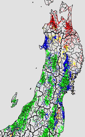 各種文献などを参考にして、分げつ形成に関する限界温度を平均気温で15℃と設定し、15℃以上については1℃刻みで表示します。過去7日の移動平均値で示す。分げつの形成が遅延すると予想される地域を監視するものです。