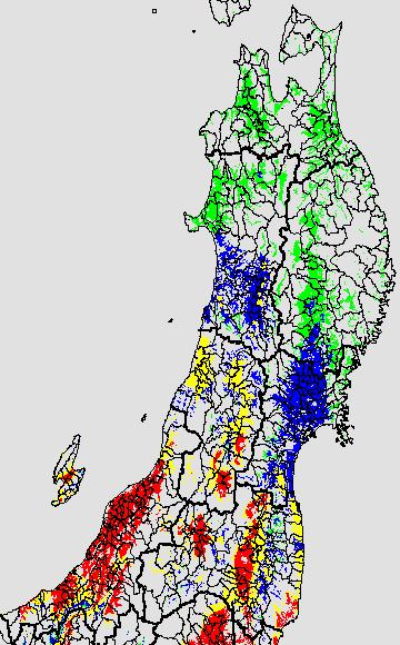 安全作期の策定にある気温指標のうち、いもち病蔓延可能日の平均気温指標20.0℃を用いて表示し、20.0℃未満については1℃刻みで表示します。過去7日の移動平均値で示す。いもち病の蔓延可能域を監視するものです。