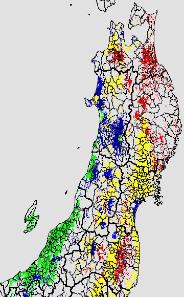 低温障害の発生の基準温度として、最低気温17℃が一般によく使われます。それを基に、極端な低温が来た地域の移り変わりを、最低気温の前3日の移動平均値で図示します。