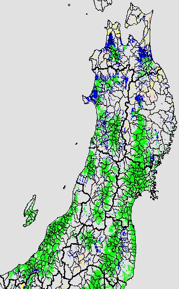 各種文献などを参考にして、分げつ形成に関する限界温度を平均気温で15℃と設定し、15℃以上については1℃刻みで表示します。過去7日の移動平均値で示す。分げつの形成が遅延すると予想される地域を監視するものです。