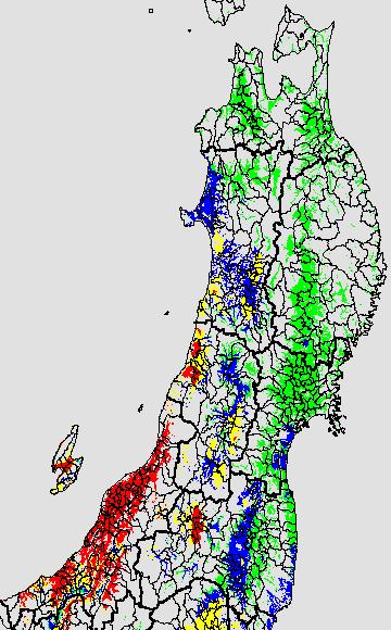 安全作期の策定にある気温指標のうち、いもち病蔓延可能日の平均気温指標20.0℃を用いて表示しています。20.0℃未満については1℃刻みで表示し、可能域がどのように推移するかをみるものです。