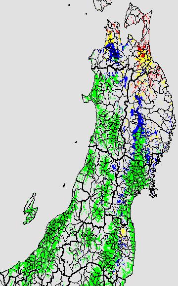 各種文献などを参考にして、分げつ形成に関する限界温度を平均気温で15℃と設定し、15℃以上については1℃刻みで表示します。過去7日の移動平均値で示す。分げつの形成が遅延すると予想される地域を監視するものです。