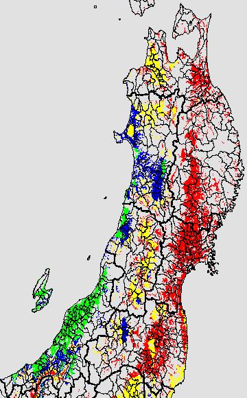 各種文献などを参考にして、分げつ形成に関する限界温度を平均気温で15℃と設定し、15℃以上については1℃刻みで表示します。過去7日の移動平均値で示す。分げつの形成が遅延すると予想される地域を監視するものです。