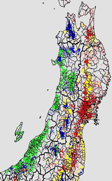 各種文献などを参考にして、分げつ形成に関する限界温度を平均気温で15℃と設定し、15℃以上については1℃刻みで表示します。過去7日の移動平均値で示す。分げつの形成が遅延すると予想される地域を監視するものです。