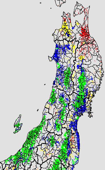 各種文献などを参考にして、分げつ形成に関する限界温度を平均気温で15℃と設定し、15℃以上については1℃刻みで表示します。過去7日の移動平均値で示す。分げつの形成が遅延すると予想される地域を監視するものです。