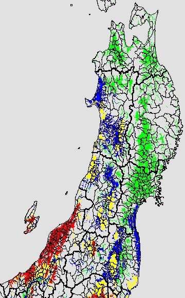 安全作期の策定にある気温指標のうち、いもち病蔓延可能日の平均気温指標20.0℃を用いて表示し、20.0℃未満については1℃刻みで表示します。過去7日の移動平均値で示す。いもち病の蔓延可能域を監視するものです。