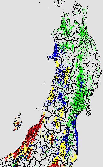 安全作期の策定にある気温指標のうち、いもち病蔓延可能日の平均気温指標20.0℃を用いて表示し、20.0℃未満については1℃刻みで表示します。過去7日の移動平均値で示す。いもち病の蔓延可能域を監視するものです。