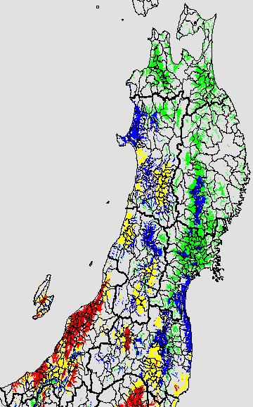 安全作期の策定にある気温指標のうち、いもち病蔓延可能日の平均気温指標20.0℃を用いて表示し、20.0℃未満については1℃刻みで表示します。過去7日の移動平均値で示す。いもち病の蔓延可能域を監視するものです。