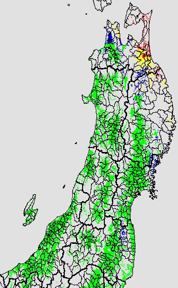 各種文献などを参考にして、分げつ形成に関する限界温度を平均気温で15℃と設定し、15℃以上については1℃刻みで表示します。過去7日の移動平均値で示す。分げつの形成が遅延すると予想される地域を監視するものです。