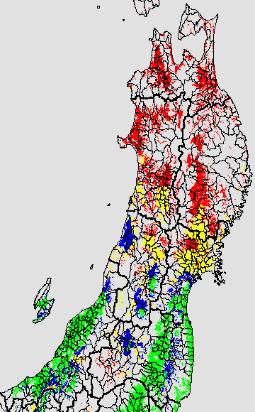 安全作期の策定にある気温指標のうち、中苗・成苗移植の安全早限日の気温指標13.0℃を用いて表示しています。13.0℃以下については1℃刻みで表示し、可能域がどのように推移するかをみるものです。