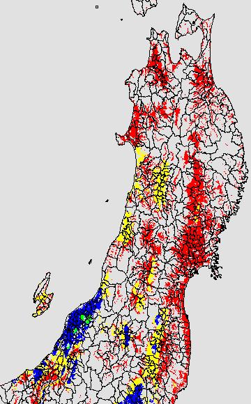 各種文献などを参考にして、分げつ形成に関する限界温度を平均気温で15℃と設定し、15℃以上については1℃刻みで表示します。過去7日の移動平均値で示す。分げつの形成が遅延すると予想される地域を監視するものです。