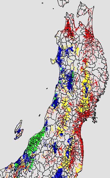 各種文献などを参考にして、分げつ形成に関する限界温度を平均気温で15℃と設定し、15℃以上については1℃刻みで表示します。過去7日の移動平均値で示す。分げつの形成が遅延すると予想される地域を監視するものです。