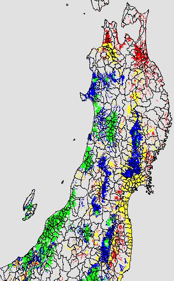 各種文献などを参考にして、分げつ形成に関する限界温度を平均気温で15℃と設定し、15℃以上については1℃刻みで表示します。過去7日の移動平均値で示す。分げつの形成が遅延すると予想される地域を監視するものです。