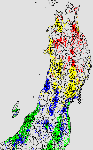 登熟停止が懸念される最低気温として、八柳(1960)は10℃を設定している。それを基に、極端な低温が来た地域の移り変わりを、最低気温の前3日の移動平均値で図示する。