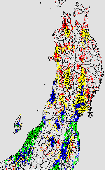 各種文献などを参考にして、分げつ形成に関する限界温度を平均気温で15℃と設定し、15℃以上については1℃刻みで表示します。過去7日の移動平均値で示す。分げつの形成が遅延すると予想される地域を監視するものです。