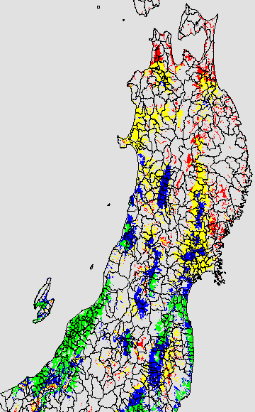 各種文献などを参考にして、分げつ形成に関する限界温度を平均気温で15℃と設定し、15℃以上については1℃刻みで表示します。過去7日の移動平均値で示す。分げつの形成が遅延すると予想される地域を監視するものです。
