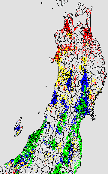 各種文献などを参考にして、分げつ形成に関する限界温度を平均気温で15℃と設定し、15℃以上については1℃刻みで表示します。過去7日の移動平均値で示す。分げつの形成が遅延すると予想される地域を監視するものです。