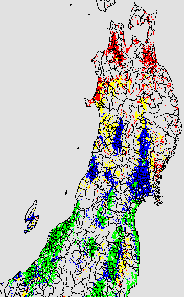 各種文献などを参考にして、分げつ形成に関する限界温度を平均気温で15℃と設定し、15℃以上については1℃刻みで表示します。過去7日の移動平均値で示す。分げつの形成が遅延すると予想される地域を監視するものです。