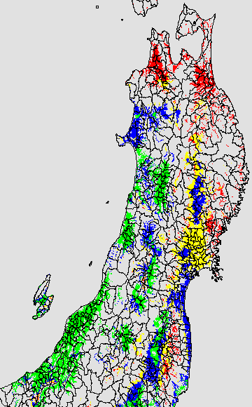 各種文献などを参考にして、分げつ形成に関する限界温度を平均気温で15℃と設定し、15℃以上については1℃刻みで表示します。過去7日の移動平均値で示す。分げつの形成が遅延すると予想される地域を監視するものです。