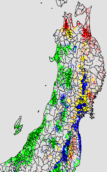 各種文献などを参考にして、分げつ形成に関する限界温度を平均気温で15℃と設定し、15℃以上については1℃刻みで表示します。過去7日の移動平均値で示す。分げつの形成が遅延すると予想される地域を監視するものです。