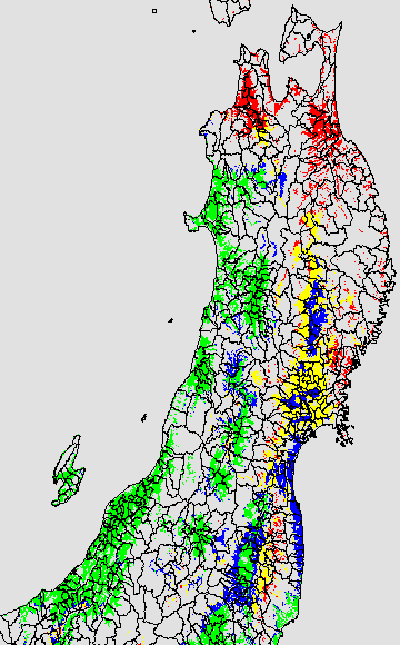 各種文献などを参考にして、分げつ形成に関する限界温度を平均気温で15℃と設定し、15℃以上については1℃刻みで表示します。過去7日の移動平均値で示す。分げつの形成が遅延すると予想される地域を監視するものです。