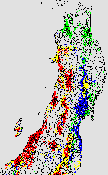 安全作期の策定にある気温指標のうち、いもち病蔓延可能日の平均気温指標20.0℃を用いて表示し、20.0℃未満については1℃刻みで表示します。過去7日の移動平均値で示しています。いもち病の蔓延可能域を監視するものです。 葉いもち発生予察メッシュと併せてご覧ください。
