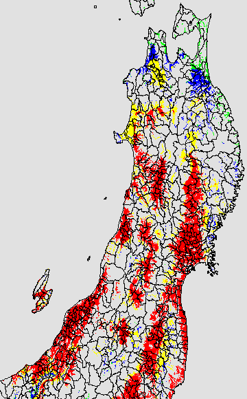 安全作期の策定にある気温指標のうち、いもち病蔓延可能日の平均気温指標20.0℃を用いて表示し、20.0℃未満については1℃刻みで表示します。過去7日の移動平均値で示しています。いもち病の蔓延可能域を監視するものです。 葉いもち発生予察メッシュと併せてご覧ください。