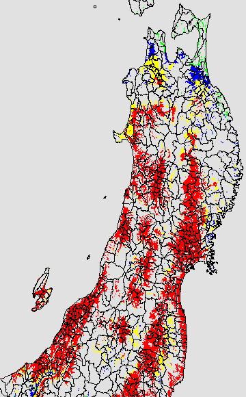 安全作期の策定にある気温指標のうち、いもち病蔓延可能日の平均気温指標20.0℃を用いて表示し、20.0℃未満については1℃刻みで表示します。過去7日の移動平均値で示しています。いもち病の蔓延可能域を監視するものです。 葉いもち発生予察メッシュと併せてご覧ください。