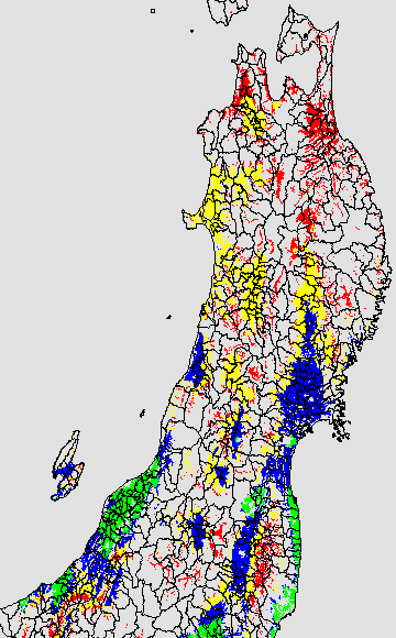 各種文献などを参考にして、草丈・根の伸長に関する限界温度を平均気温で13℃と設定し、13℃以上については1℃刻みで表示します。過去7日の移動平均値で示す。草丈や根の伸長が遅延すると予想される地域を監視するものです。