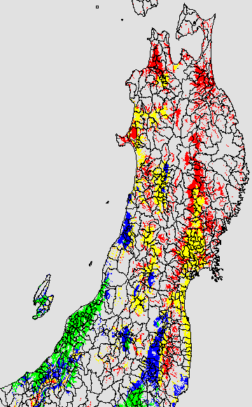 各種文献などを参考にして、分げつ形成に関する限界温度を平均気温で15℃と設定し、15℃以上については1℃刻みで表示します。過去7日の移動平均値で示す。分げつの形成が遅延すると予想される地域を監視するものです。