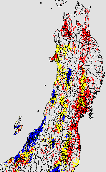 各種文献などを参考にして、分げつ形成に関する限界温度を平均気温で15℃と設定し、15℃以上については1℃刻みで表示します。過去7日の移動平均値で示す。分げつの形成が遅延すると予想される地域を監視するものです。