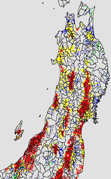 安全作期の策定にある気温指標のうち、いもち病蔓延可能日の平均気温指標20.0℃を用いて表示し、20.0℃未満については1℃刻みで表示します。過去7日の移動平均値で示しています。いもち病の蔓延可能域を監視するものです。葉いもち発生予察メッシュと併せてご覧ください。