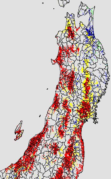 安全作期の策定にある気温指標のうち、いもち病蔓延可能日の平均気温指標20.0℃を用いて表示し、20.0℃未満については1℃刻みで表示します。過去7日の移動平均値で示しています。いもち病の蔓延可能域を監視するものです。葉いもち発生予察メッシュと併せてご覧ください。