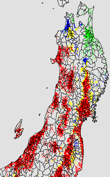 安全作期の策定にある気温指標のうち、いもち病蔓延可能日の平均気温指標20.0℃を用いて表示し、20.0℃未満については1℃刻みで表示します。過去7日の移動平均値で示しています。いもち病の蔓延可能域を監視するものです。葉いもち発生予察メッシュと併せてご覧ください。