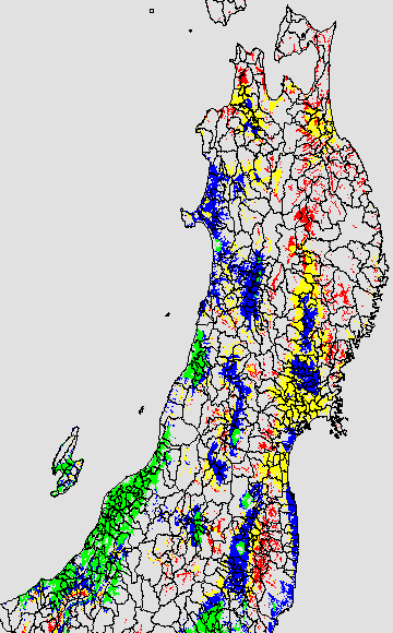 各種文献などを参考にして、草丈・根の伸長に関する限界温度を平均気温で13℃と設定し、13℃以上については1℃刻みで表示します。過去7日の移動平均値で示す。草丈や根の伸長が遅延すると予想される地域を監視するものです。