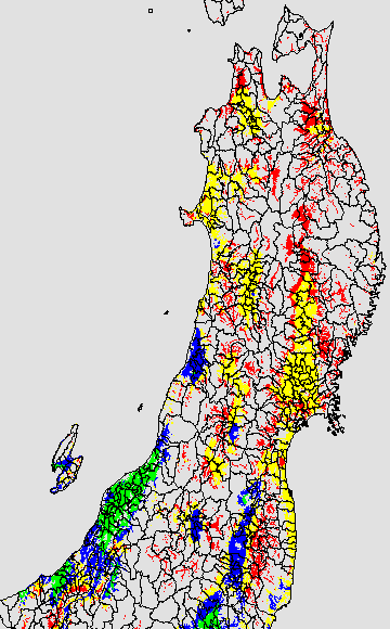 各種文献などを参考にして、分げつ形成に関する限界温度を平均気温で15℃と設定し、15℃以上については1℃刻みで表示します。過去7日の移動平均値で示す。分げつの形成が遅延すると予想される地域を監視するものです。