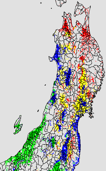 各種文献などを参考にして、草丈・根の伸長に関する限界温度を平均気温で13℃と設定し、13℃以上については1℃刻みで表示します。過去7日の移動平均値で示す。草丈や根の伸長が遅延すると予想される地域を監視するものです。