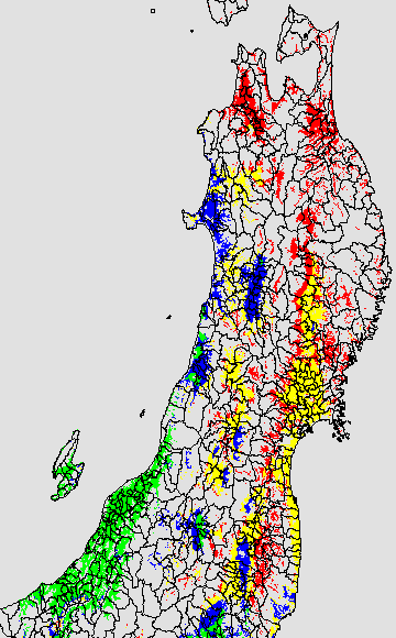 各種文献などを参考にして、草丈・根の伸長に関する限界温度を平均気温で13℃と設定し、13℃以上については1℃刻みで表示します。過去7日の移動平均値で示す。草丈や根の伸長が遅延すると予想される地域を監視するものです。