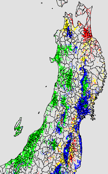 各種文献などを参考にして、草丈・根の伸長に関する限界温度を平均気温で13℃と設定し、13℃以上については1℃刻みで表示します。過去7日の移動平均値で示す。草丈や根の伸長が遅延すると予想される地域を監視するものです。