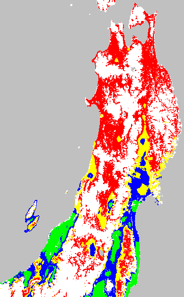 安全作期の策定にある気温指標のうち、中苗・成苗移植の安全早限日の気温指標13.0℃を用いて表示しています。13.0℃以下については1℃刻みで表示し、可能域がどのように推移するかをみるものです。