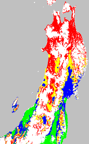 安全作期の策定にある気温指標のうち、稚苗移植の安全早限日の気温指標12.0℃を用いて表示しています。12.0℃以下については1℃刻みで表示し、可能域がどのように推移するかをみるものです。