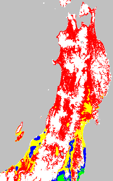 安全作期の策定にある気温指標のうち、乾田直播の安全早限日の気温指標13.5℃を用いて表示しています。13.5℃以下については1℃刻みで表示し、可能域がどのように推移するかをみるものです。