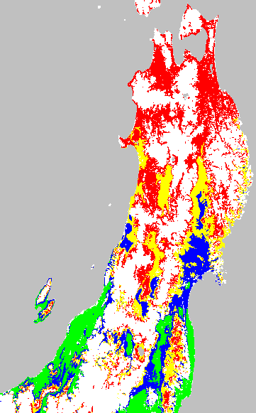 安全作期の策定にある気温指標のうち、稚苗移植の安全早限日の気温指標12.0℃を用いて表示しています。12.0℃以下については1℃刻みで表示し、可能域がどのように推移するかをみるものです。