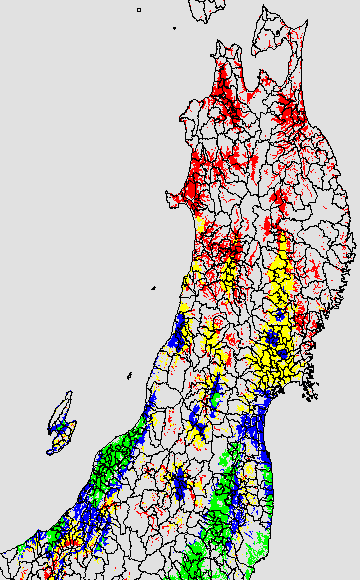 各種文献などを参考にして、草丈・根の伸長に関する限界温度を平均気温で13℃と設定し、13℃以上については1℃刻みで表示します。過去7日の移動平均値で示す。草丈や根の伸長が遅延すると予想される地域を監視するものです。
