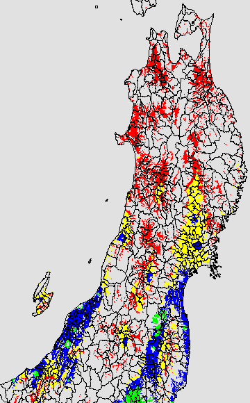 各種文献などを参考にして、分げつ形成に関する限界温度を平均気温で15℃と設定し、15℃以上については1℃刻みで表示します。過去7日の移動平均値で示す。分げつの形成が遅延すると予想される地域を監視するものです。