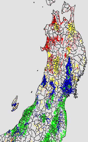 各種文献などを参考にして、分げつ形成に関する限界温度を平均気温で15℃と設定し、15℃以上については1℃刻みで表示します。過去7日の移動平均値で示す。分げつの形成が遅延すると予想される地域を監視するものです。