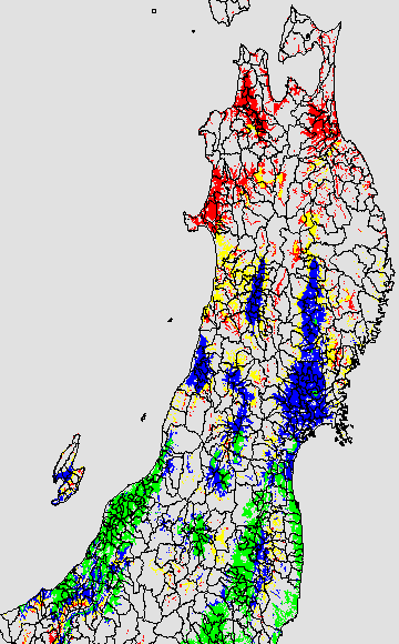 各種文献などを参考にして、分げつ形成に関する限界温度を平均気温で15℃と設定し、15℃以上については1℃刻みで表示します。過去7日の移動平均値で示す。分げつの形成が遅延すると予想される地域を監視するものです。